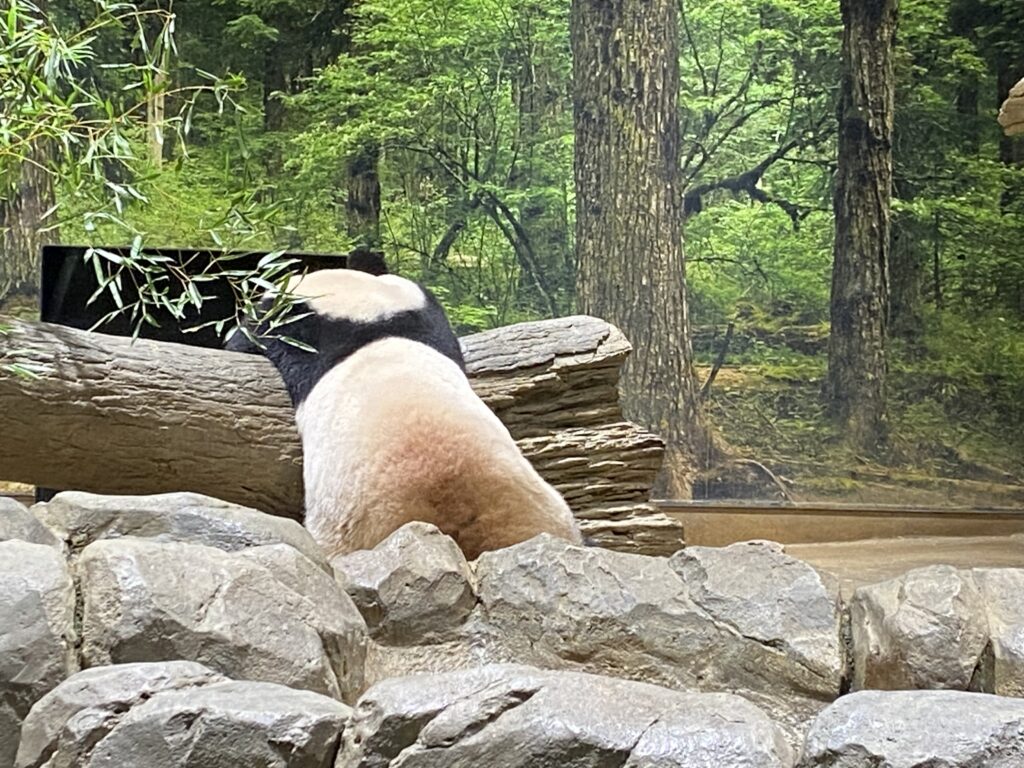 上野動物園のパンダは、数年前に見た時は確かガラスの部屋にいて90秒のみの観覧だったのですが、今回のシャオシャオは元気に屋外で遊んでいて、時間制限なく観覧できました。こちらは待ち時間30分とあったのですが、実際は15分ほどの待ち時間でした。